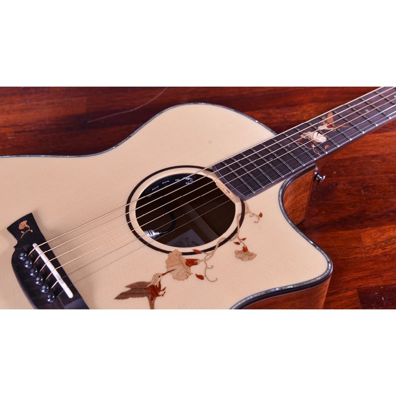 Crafter TB G-MAHOce, questa Grand Auditorium cutaway model nasce per soddisfare al meglio le esigenze del chitarrista professionista, in quanto unisce una scelta di legni e il relativo abbinamento con cura e massima precisione, per un suono preciso, ricco di armoniche ed adatto anche alle richieste più raffinate. Le serie anniversary riflettono la bellezza estetica delle arti orientali con raffigurazioni della natura, con inserti di legni pregiati o in madreperla.