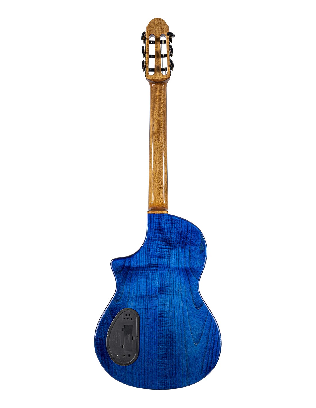 Il body in Mogano massello chambered è sottile come quello di un’ elettrica ed è estremamente leggero. Il top in Acero Fiammato nelle finiture laccate high gloss a bordi sfumati, enfatizzano l’eleganza della chitarra.