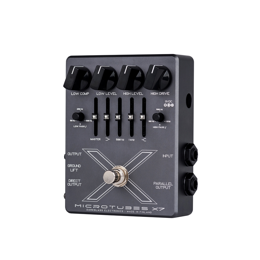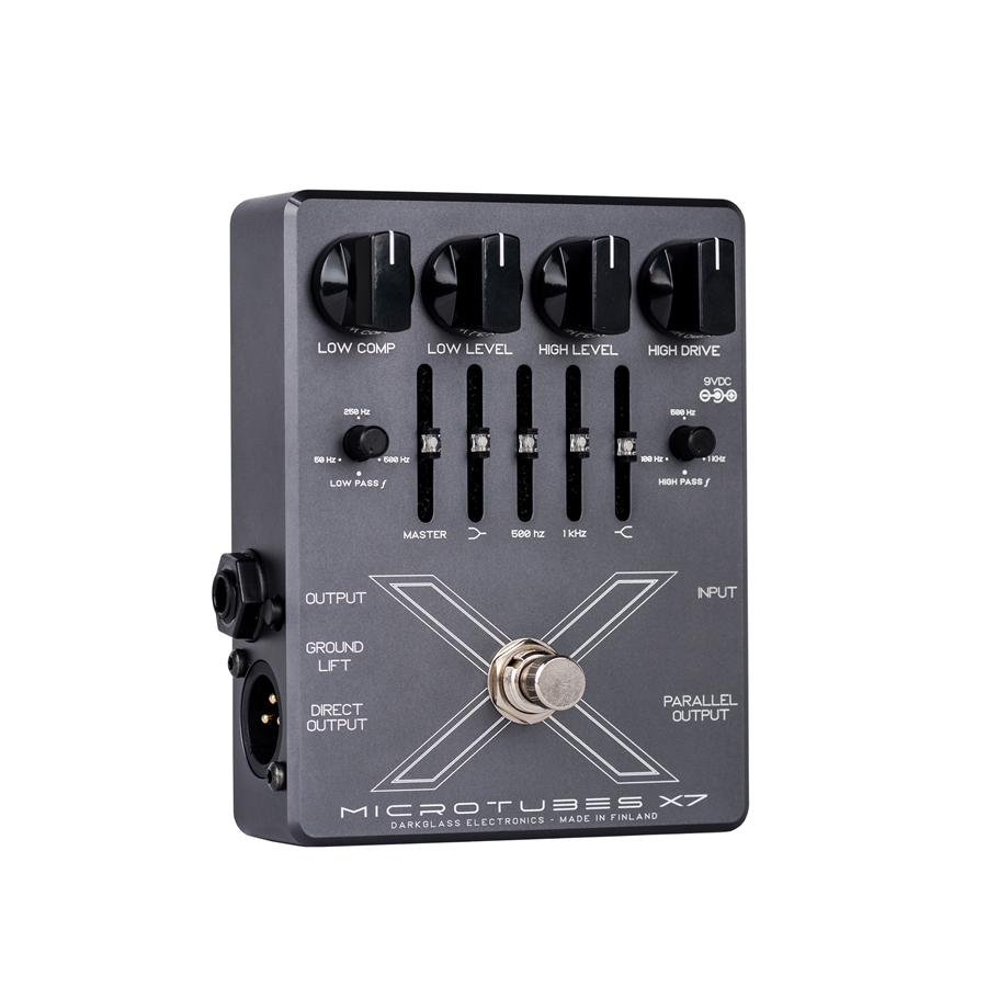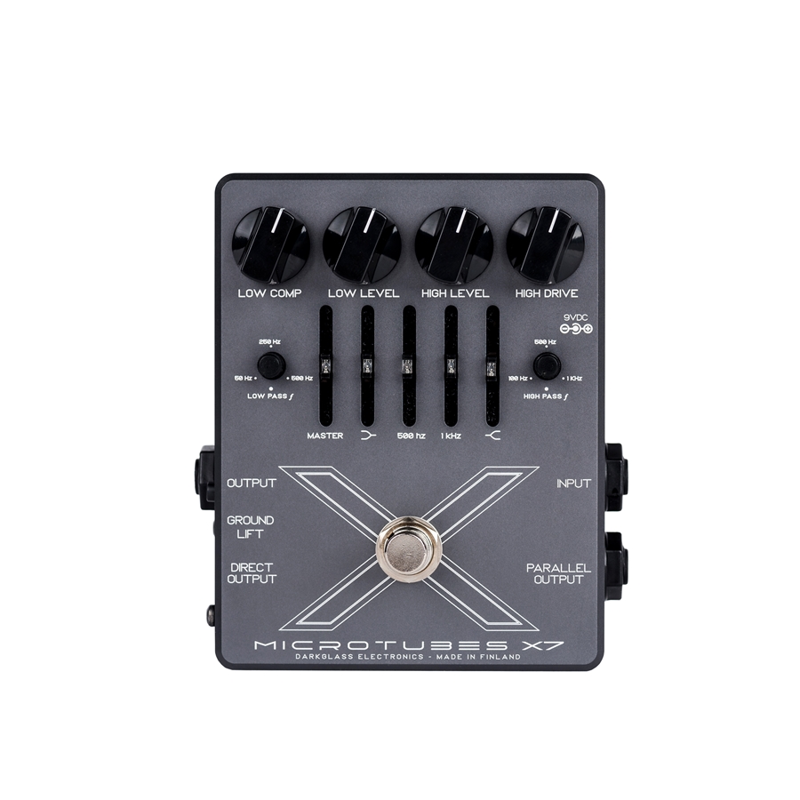 Il preamplificatore per basso Microtubes X7 di Darkglass rappresenta la ricetta per potenti bassi distorti che mantengono l'impatto delle basse frequenze. La chiave per bassi incisivi distorti è consentire alle medie ed alle alte di fornire una distorsione armonica, lasciando le fondamentali basse solide e senza distorsione. Il pedale Microtubes X7 raggiunge questo risultato suddividendo il segnale su due filtri variabili prima dello stadio del Gain, in modo da poter modellare il tuo suono distorto unico con la giusta regolazione. Completo di EQ grafico a 4 bande per perfezionare il carattere della fascia media, il preamplificatore a pedale per basso Darkglass Microtube X7 offre suoni potenti, tesi e definiti con qualsiasi basso. Prima di distorcere il suono, il preamplificatore per basso Darkglass Microtubes X7 divide il segnale in due e li filtra entrambi. Un filtro passa-basse variabile ti consente di scegliere quanta parte del segnale rimarrà pulita e incisiva, mentre un filtro passa-alte determina la quantità di suono che verrà inviata attraverso il circuito del drive. I controlli di livello indipendenti per ciascun percorso del segnale consentono di bilanciare ognuno a proprio piacimento.