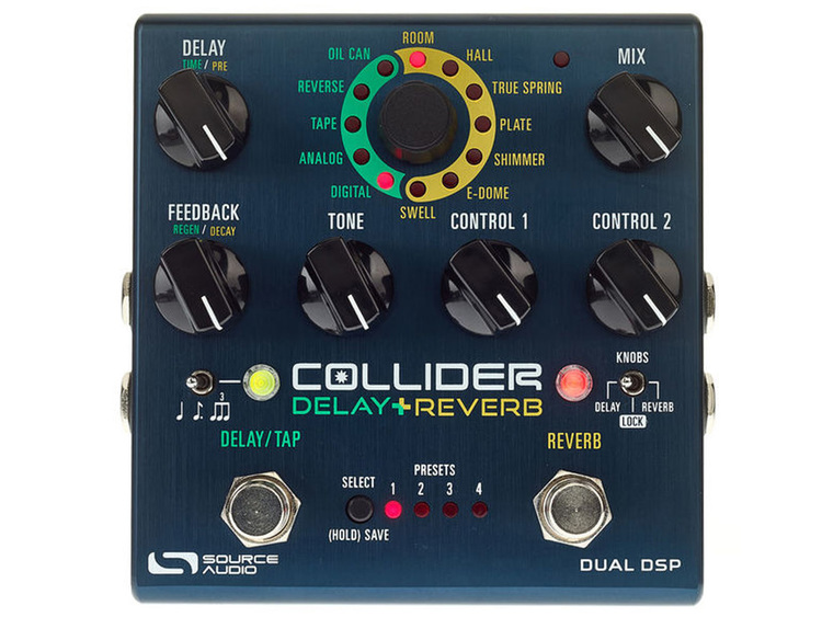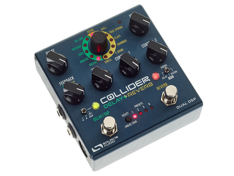 Il Collider offre una collezione eccezionale di suoni ricchi e spaziosi, comprese le riproduzioni realistiche di delay analogici, a nastro e Oil Can vintage, modelli classici di Spring e Plate Reverb, repliche naturali di spazi acustici grandi e piccoli e una selezione intrigante e altamente musicale di suoni "innaturali" tra cui un Reverse Delay e uno Shimmer Reverb ultraterreno.