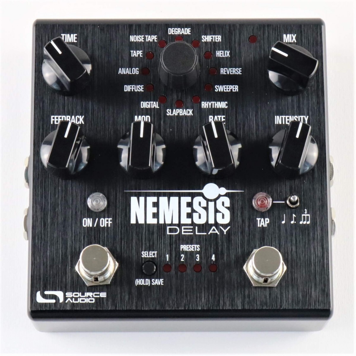 - Tap Tempo: Imposta il tempo di delay con lo switch tap tempo integrato. Le suddivisioni sono in quarti, ottava puntata e terzina