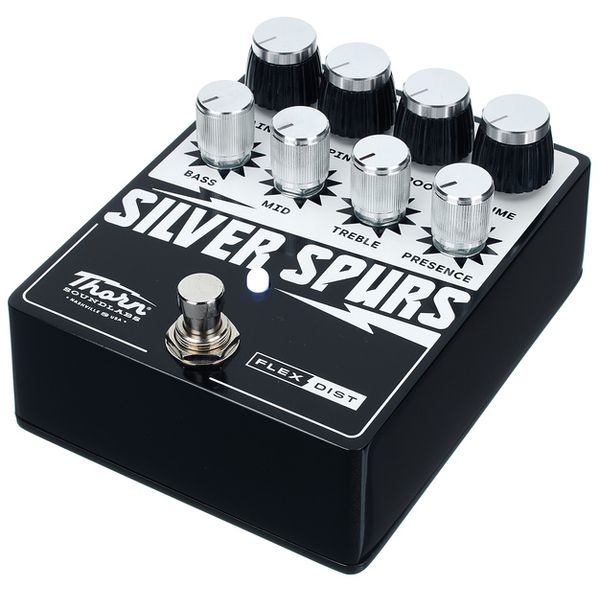 Il Thorn Silver Spurs si distingue da molti altri pedali Distortion per i due controlli Damping e Headroom: presenti su tutti i loro distorsori, potrebbero essere considerati il marchio di fabbrica di Thorn Soundlabs. Damping è un filtro passa-alto che esclude le frequenze basse dal segnale distorto, impedendo così che il suono risulti sporco o confuso. Il controllo Headroom parla da sé, poiché regola lo spazio (headroom) disponibile prima che la distorsione entri in gioco. Ciò è particolarmente interessante in combinazione con un amplificatore valvolare spinto fino al suo punto di “break-up” (cioè al limite della saturazione o della distorsione), poiché permette di controllare perfettamente i suoni che vanno dal clean al dirty (ad esempio, strofe e ritornelli) tramite la sola dinamica del proprio tocco.